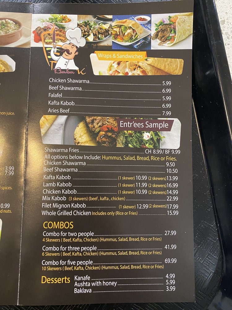 3 Skewers. Includes; chicken kabob, filet mignon kabob, and kafta kabob. Served with hummus, salad, bread, rice, or fries.